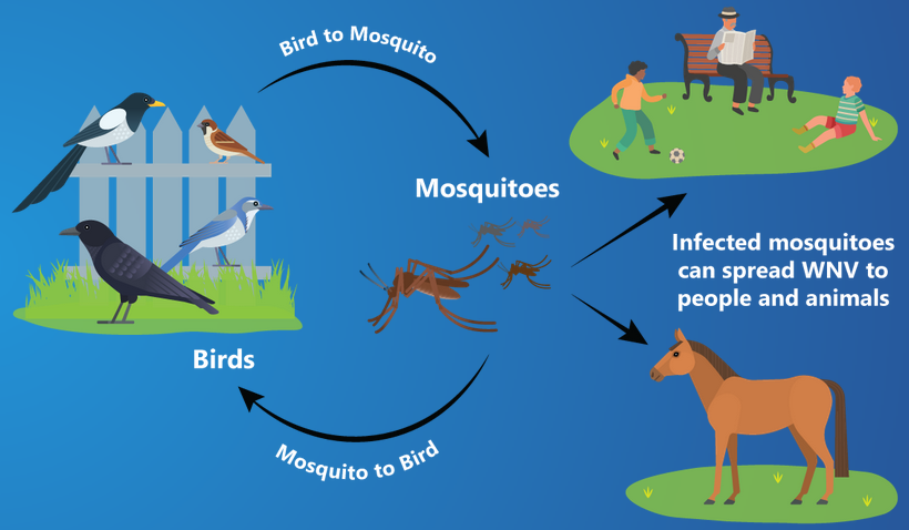 The life cycle of the West Nile virus, which is spread to humans and animals by the bite of mosquitoes that feed on the blood of infected birds.